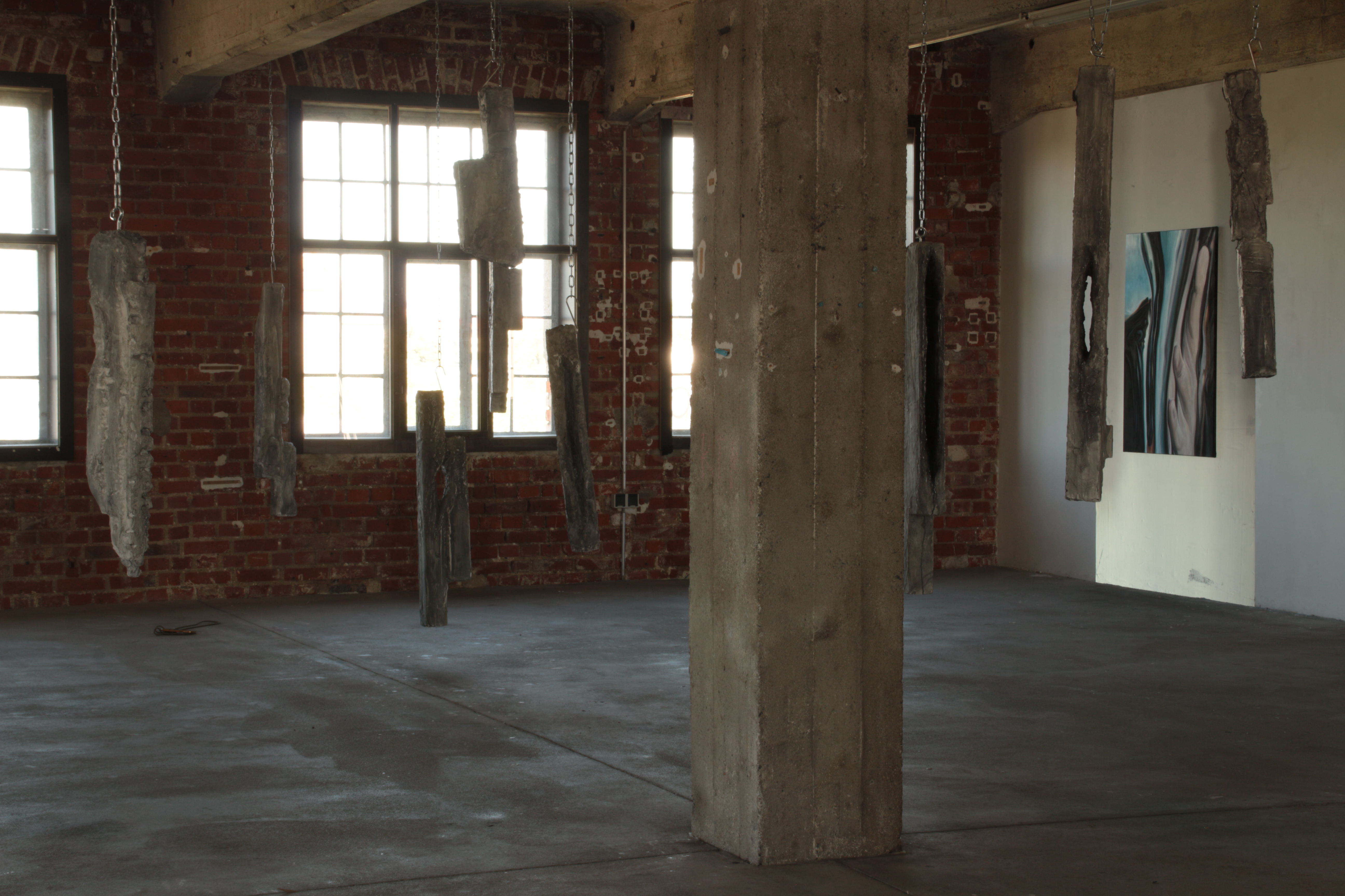 This disparate and immersive installation explores architectural abstraction and memory held within spaces. These sculptures are ghosts as well as pendulums, keepers of time and memory. They are bulging reminders that history and human experience cannot be plastered or painted over.